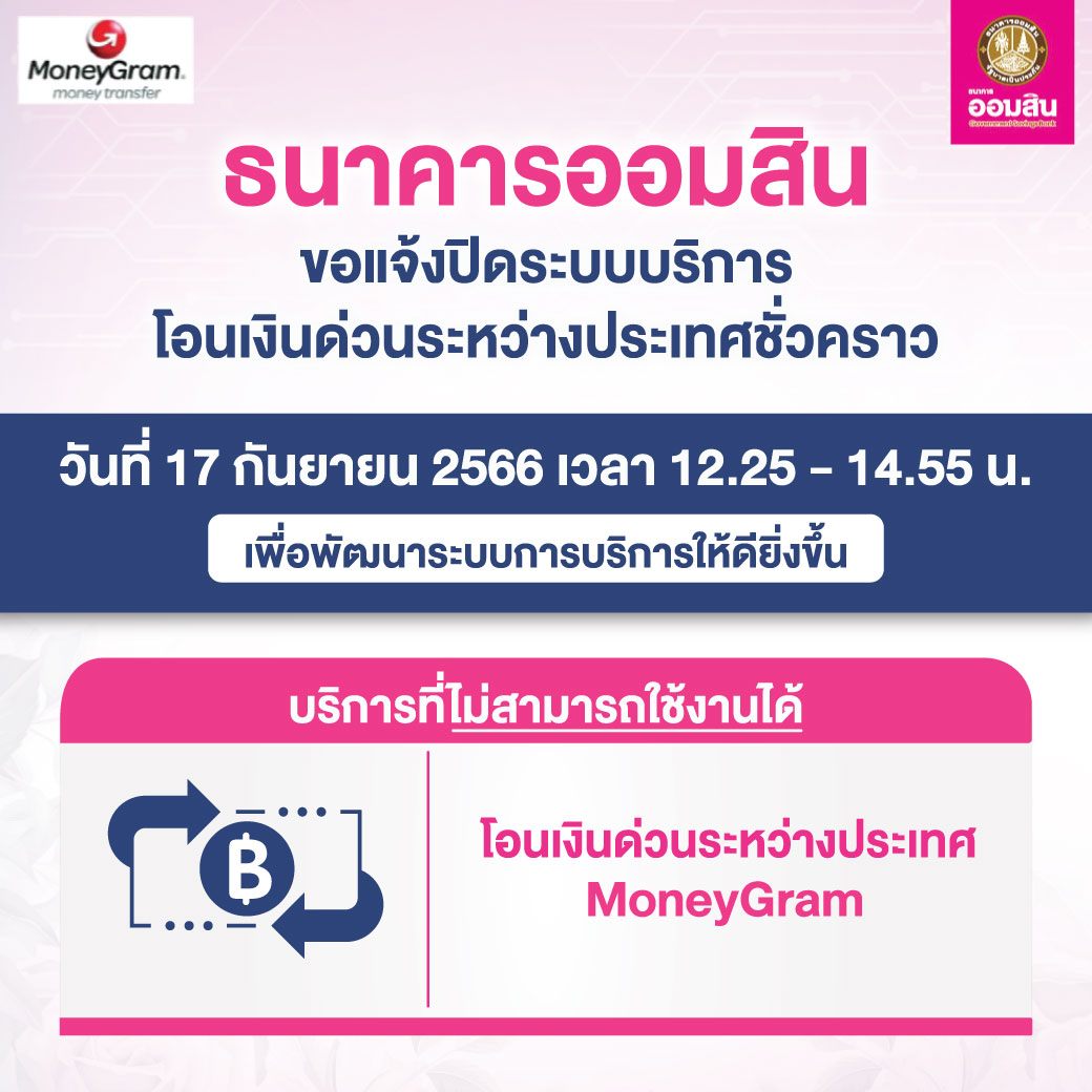 ธนาคารออมสิน ขอแจ้งปิดระบบบริการโอนเงินด่วนระหว่างประเทศชั่วคราว เพื่อปรับปรุงระบบการบริการเงินด่วนระหว่างประเทศ MoneyGram ให้ดียิ่งขึ้น ในวันที่ 17 กันยายน 2566 เวลา 12.25 – 14.55 น.