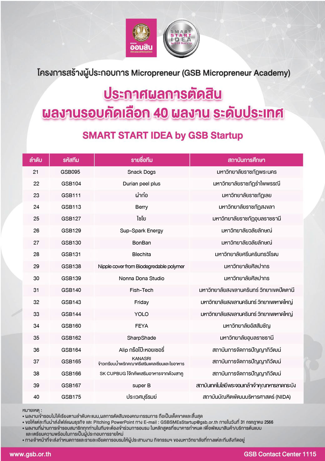 การประกาศผลการคัดเลือกผลงานกิจกรรมประกวด Smart Start Idea by GSB Startup รอบคัดเลือก 40 ผลงานระดับประเทศ ภายใต้โครงการสร้างผู้ประกอบการ Micropreneur (GSB Micropreneur Academy) ประจำปี 2566 เพื่อให้ผลงานที่ผ่านการคัดเลือกเตรียมความพร้อมสำหรับการประกวดในรอบ Prototype