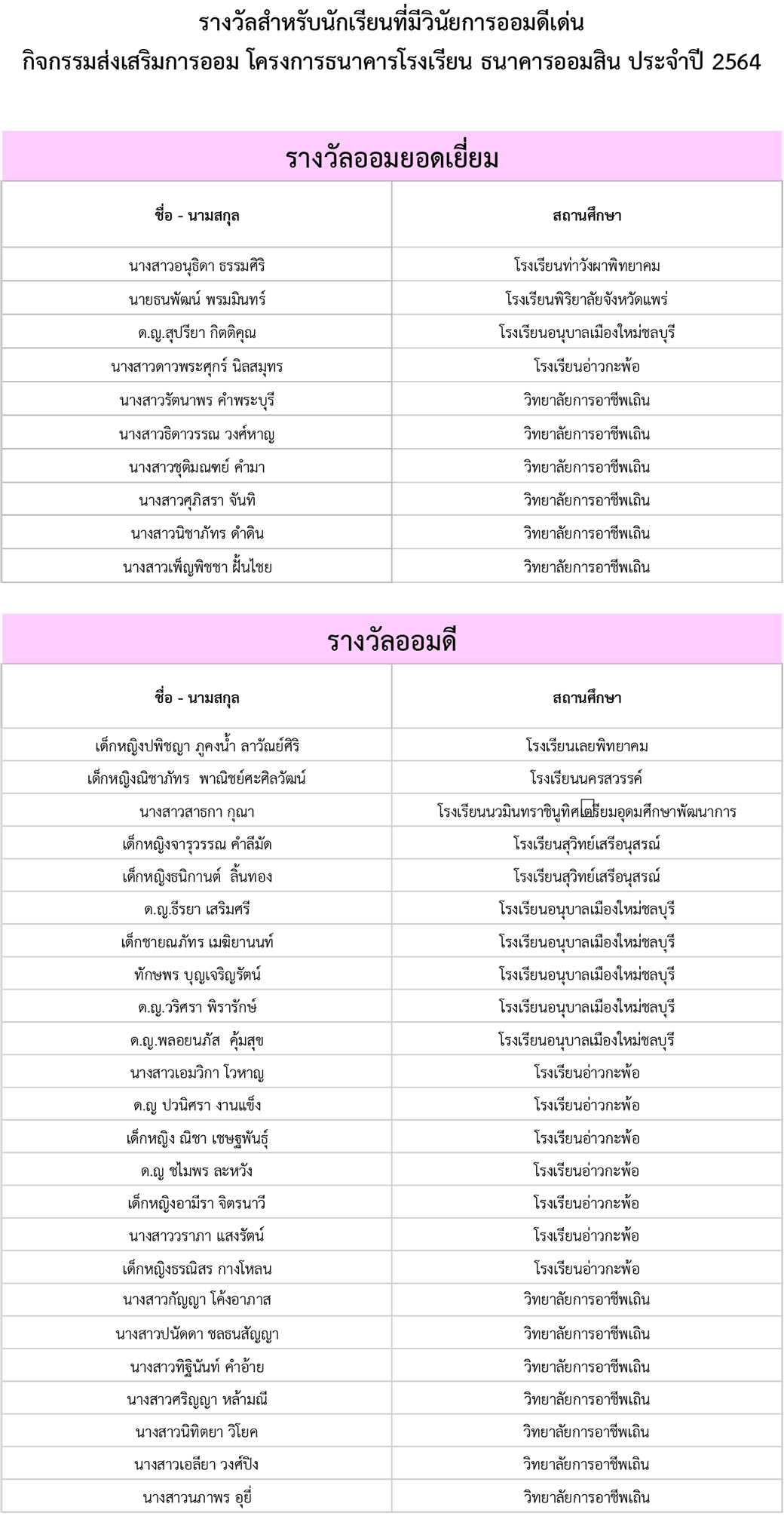 ผลประกวดธนาคารโรงเรียนส่งเสริมการออม และ นักเรียนที่มีวินัยการออมดีเด่นประจำปี 2564