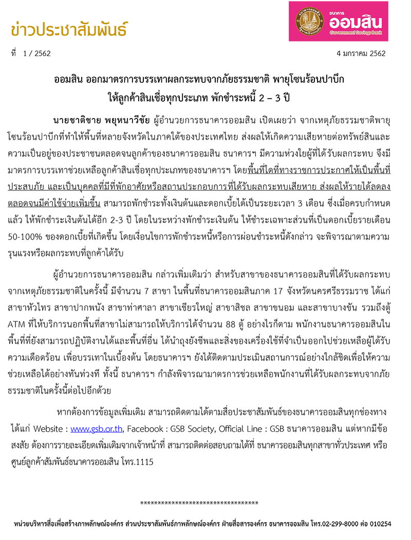 ออมสิน ออกมาตรการบรรเทาผลกระทบจากภัยธรรมชาติ พายุโซนร้อนปาบึก ให้ลูกค้าสินเชื่อทุกประเภท พักชำระหนี้ 2 – 3 ปี