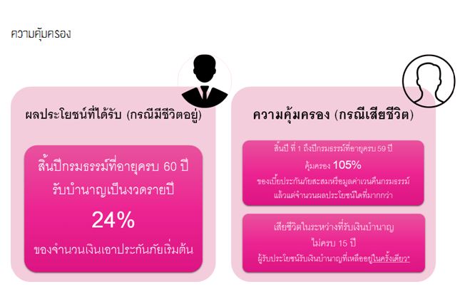 – ปีกรมธรรม์ที่อายุครบ 60 ปี ผู้เอาประกันรับบำนาญเป็นงวดรายปี 24% ของจำนวนเงินเอาประกันภัยเริ่มต้น