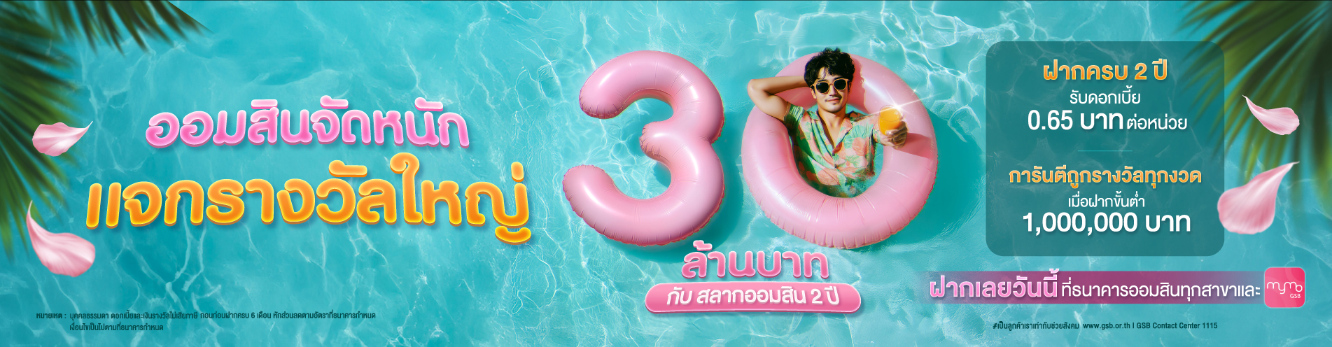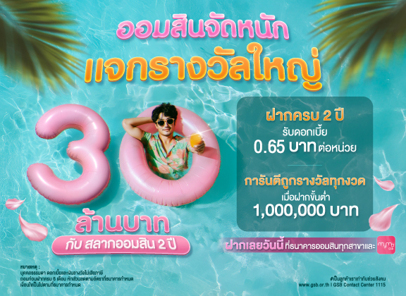 สลากออมสินพิเศษ อายุ 2 ปี งวดที่ 268 หน่วยละ 100 บาท มีสิทธิถูกรางวัลทุกเดือนเป็นเวลานานถึง 24 เดือน รางวัลที่ 1 มูลค่ารางวัล 30 ล้านบาท และรางวัลอื่นๆ อีกมากมาย เงินรางวัลและดอกเบี้ยของบุคคลธรรมดา ไม่เสียภาษี ฝากครบอายุจะโอนเงินต้นและดอกเบี้ยเข้าบัญชีเงินฝากที่เป็นบัญชีคู่โอนโดยอัตโนมัติ