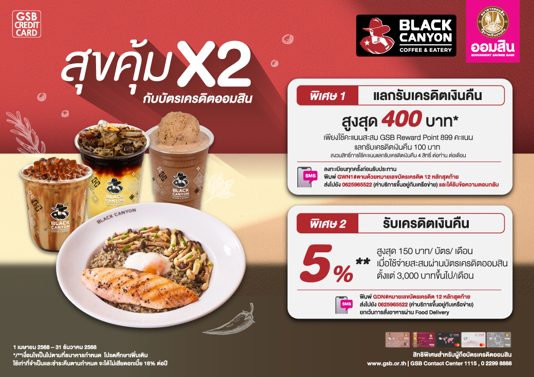 สิทธิพิเศษสำหรับผู้ถือบัตรเครดิตธนาคารออมสินทุกประเภท ที่ ร้าน Black Canyon เฉพาะสาขาที่รับบัตรเครดิตเท่านั้น